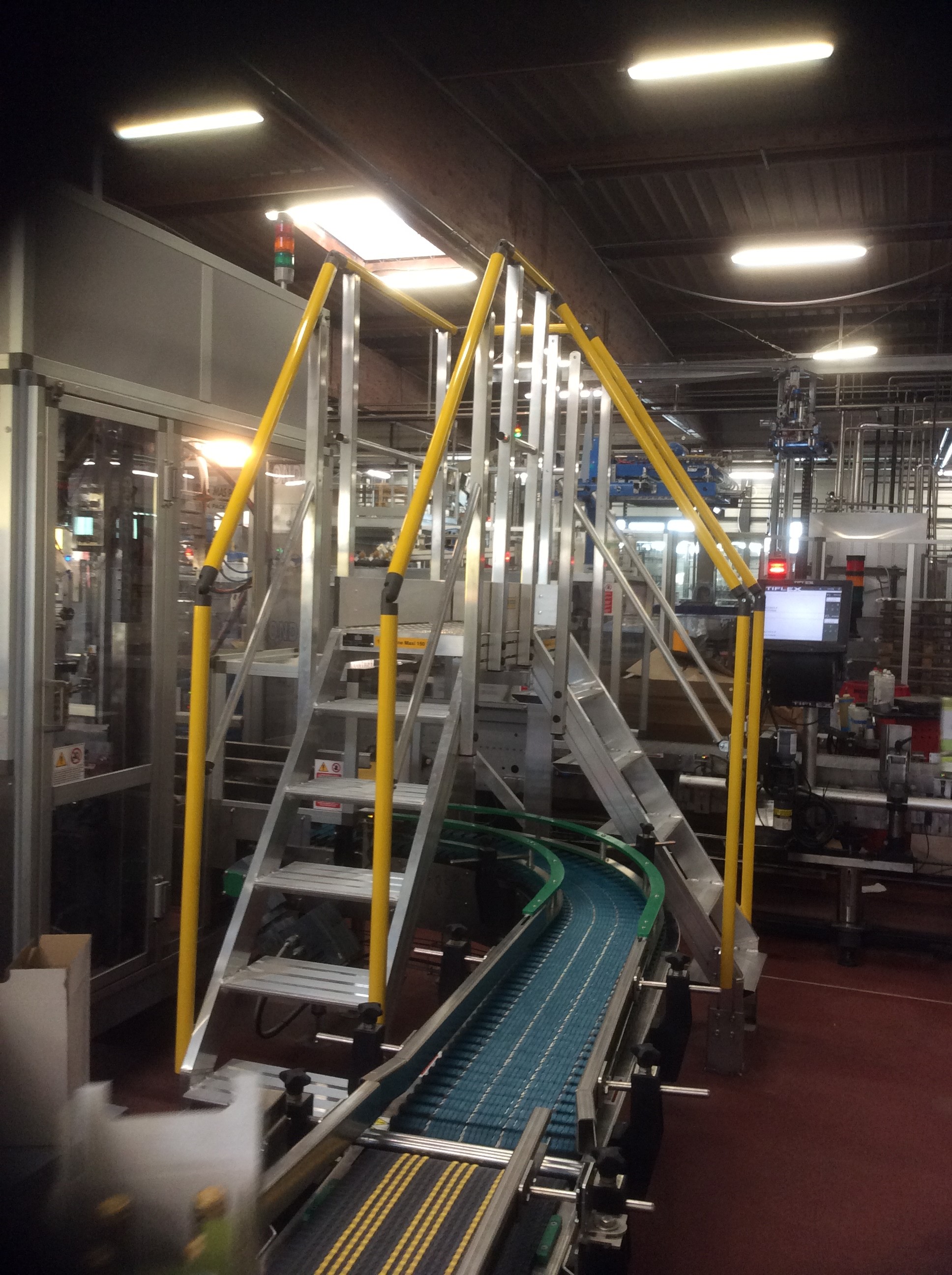 Client request: In wine industry equipped with continuously running conveyor lines, operators must be able to move from one area to another without stopping production and without risking a fall or unsafe stepping over. The access solution must be ergonomic, secure, compatible with a humid winemaking environment, and able to fit within a confined space.