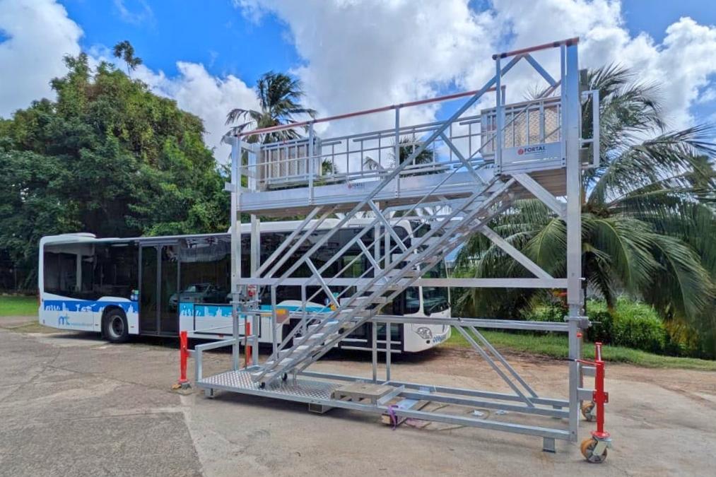 FORTAL Solution: Design and manufacture of a mobile platform dedicated to safe access to bus rooftops, specifically tailored for regular maintenance tasks (cleaning, inspection, component replacement on the roof). Height-adjustable, it easily adapts to different bus models, including electric and hydrogen buses. The platform features a large anti-slip work surface, accessible via an ergonomically designed staircase with adjustable inclination, facilitating frequent climbs and descents. The peripheral safety system, equipped with a deployable guard ring, creates a fully secured work zone, eliminating fall risks and ensuring operator safety during elevated interventions. Its construction combines extruded aluminum and galvanized steel for long-lasting durability. Mobile, it moves easily on swivel wheels with a locking system, and stabilizes perfectly in working position via dedicated supports. Result: A complete solution for safe access to bus rooftops, optimizing maintenance operations and improving working conditions for teams.