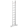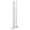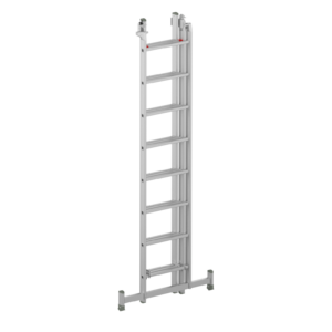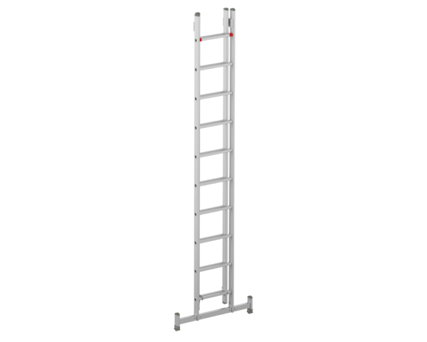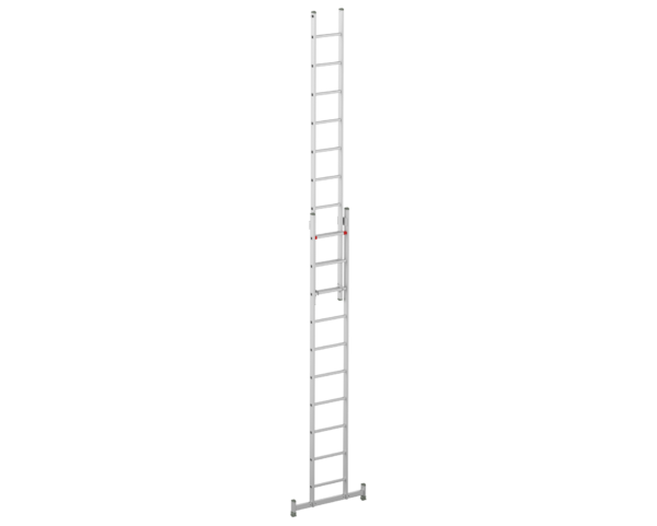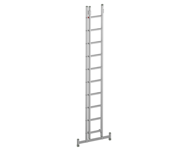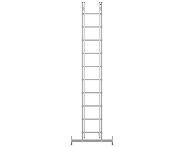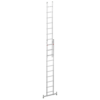 Two-section hand-operated sliding ladder, all aluminum. Distance between rungs: 280 mm – rungs section 25 x 25 mm – safety locking system – extruded profile – non-marking pads – models with 8 to 13 rungs supplied with an aluminum stabilizer (to be assembled) equipped with pads.Available with 6 to 13 rungs, serving access heights from 1.95 m to 6.70 m.