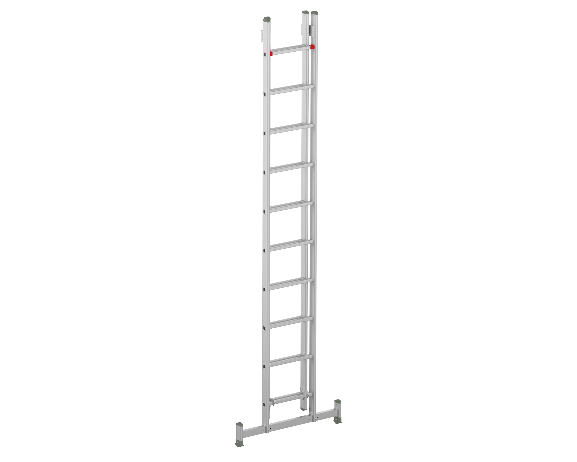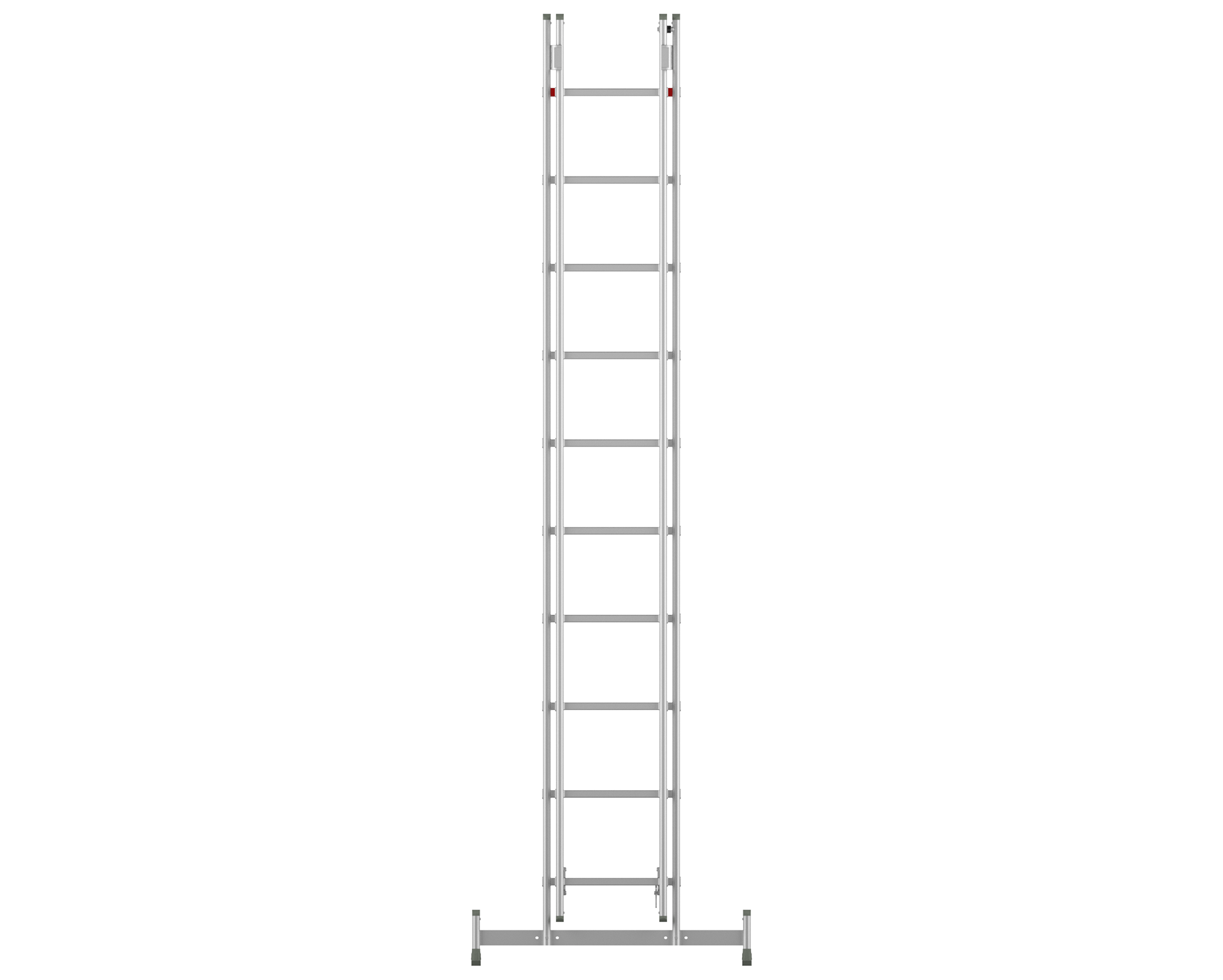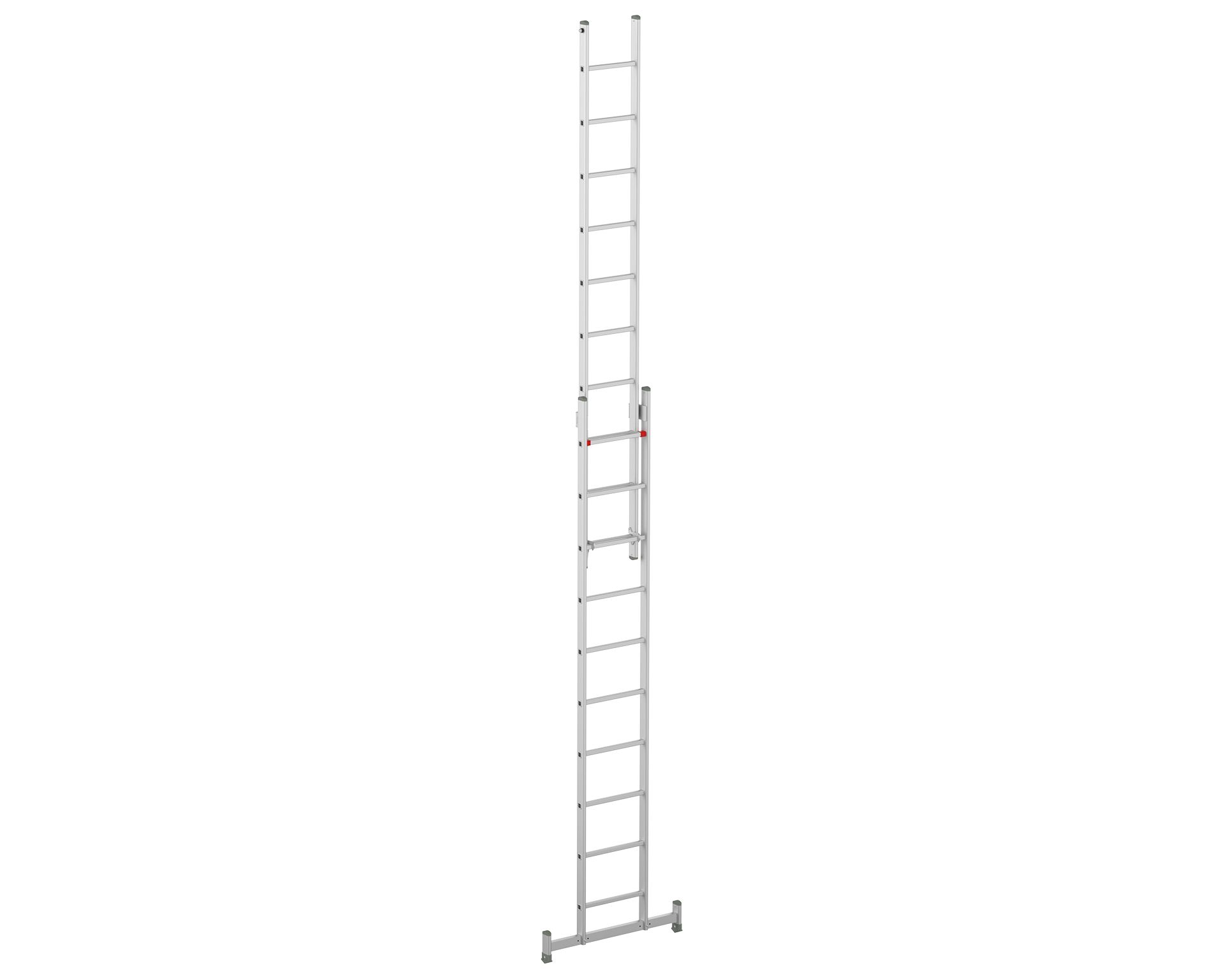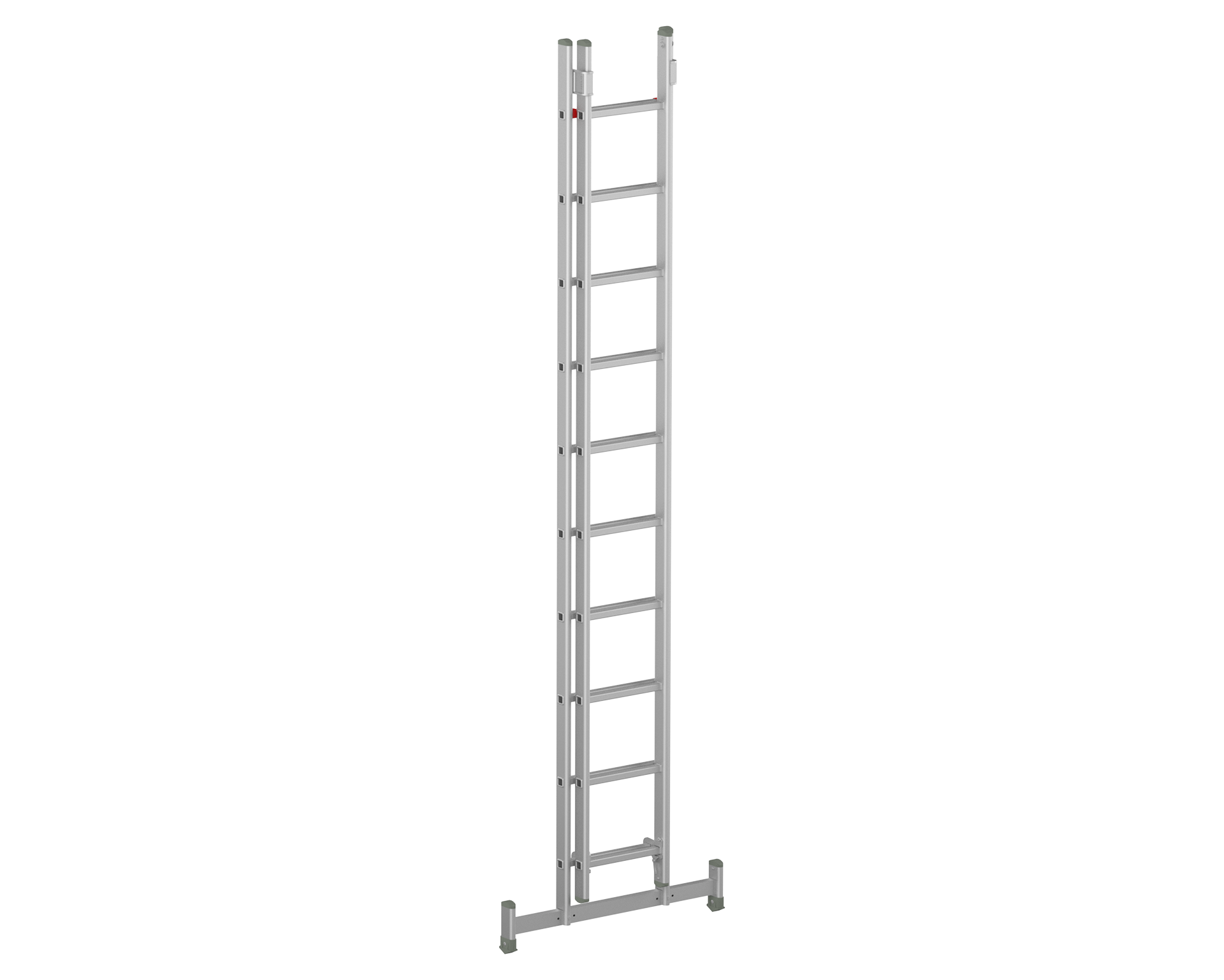 Two-section hand-operated sliding ladder, all aluminum. Distance between rungs: 280 mm – rungs section 25 x 25 mm – safety locking system – extruded profile – non-marking pads – models with 8 to 13 rungs supplied with an aluminum stabilizer (to be assembled) equipped with pads.