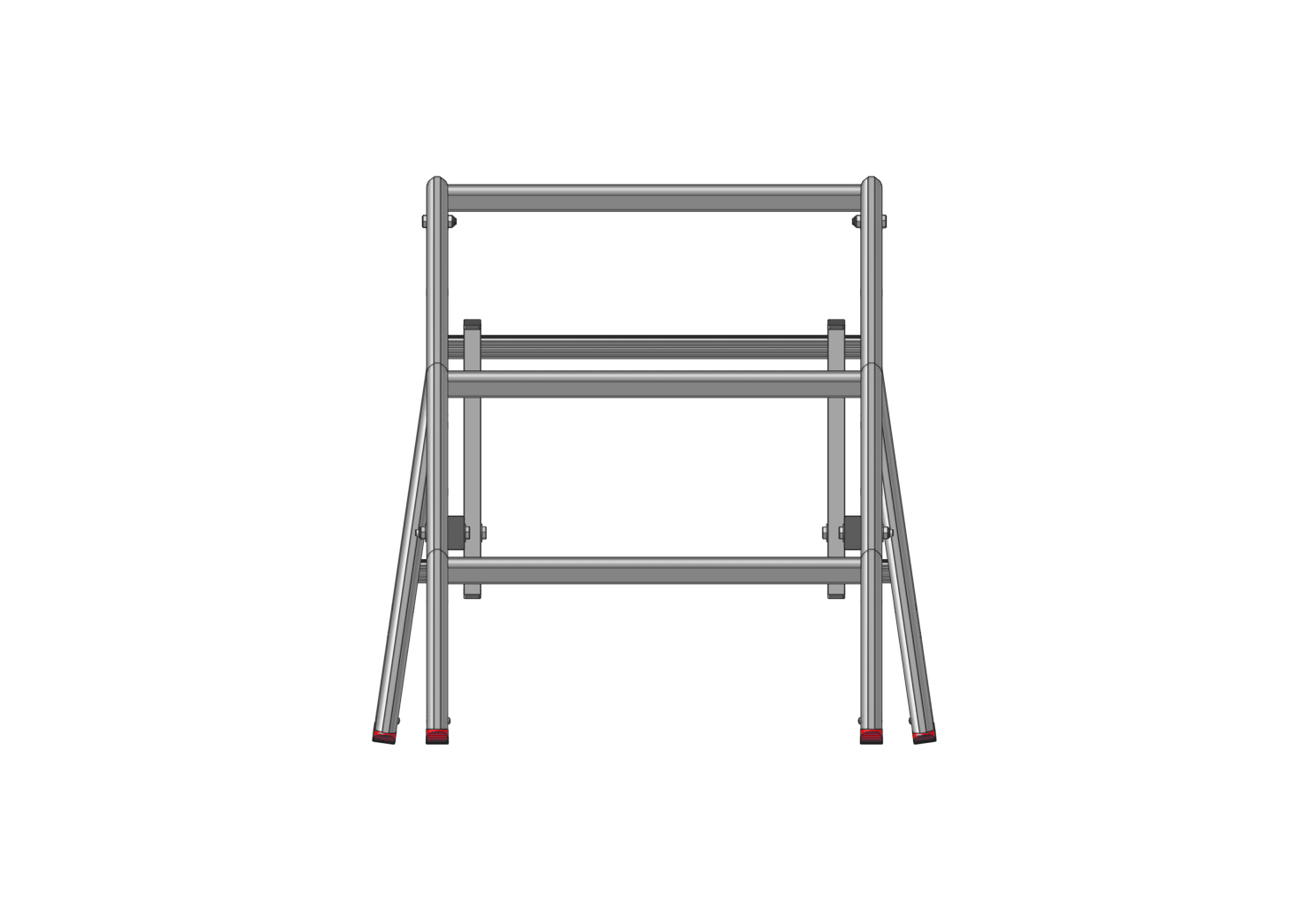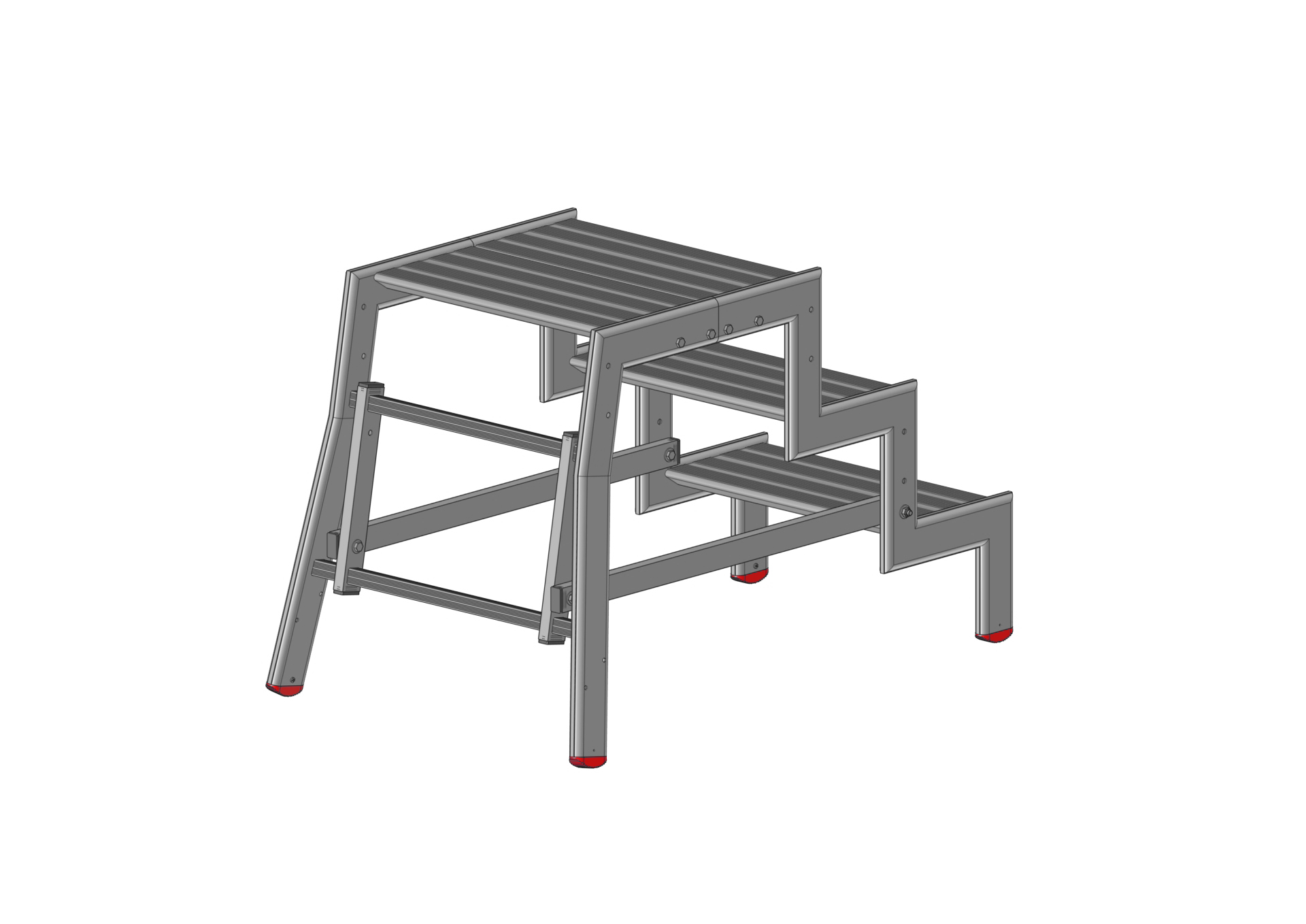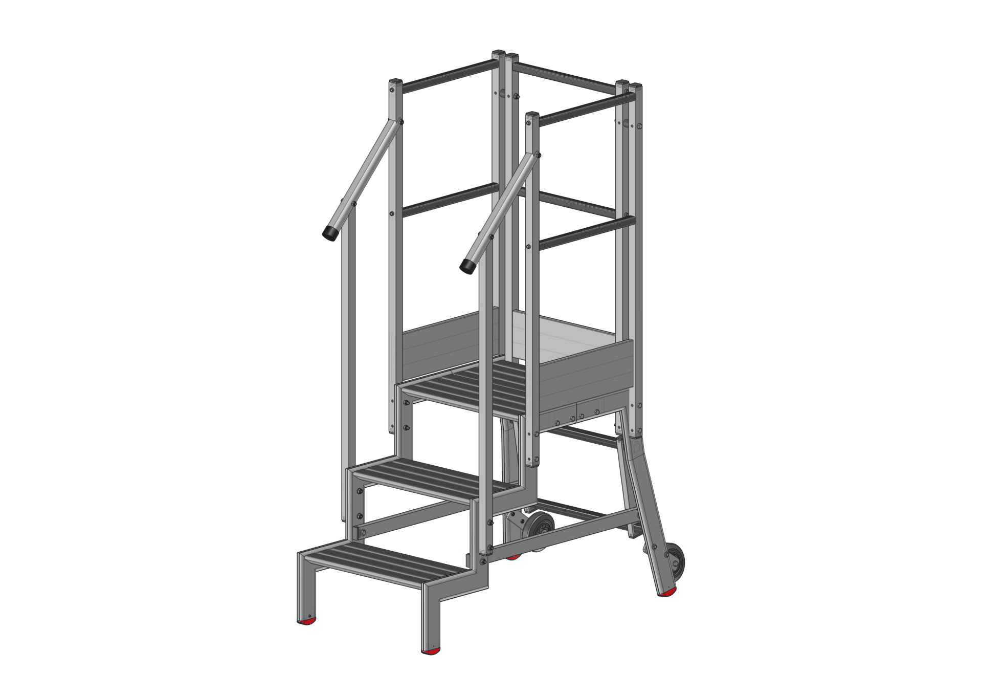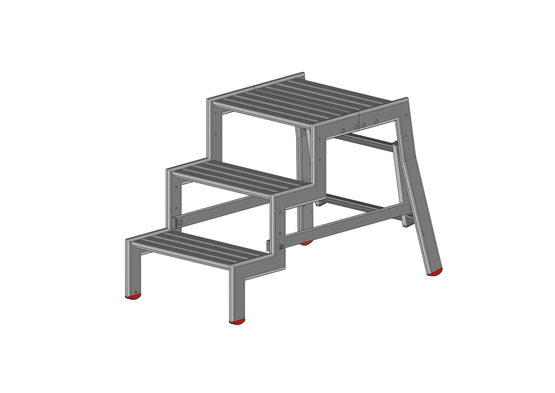 Simple access step stool, one-piece, practical and light, adapted for small-scale tasks at low height and setting people at work station. Aluminum structure. Large anti-slip ribbed steps (depth 230 mm) and platform (460 x 500 mm). Anti-slip and non-marking pads. Available from 2 to 4 steps for working height from 2.45 to 2.90 meters.Options: Left, right and/or rear guardrail – Left and/or right ramp – Rollers kit ∅125 mm
