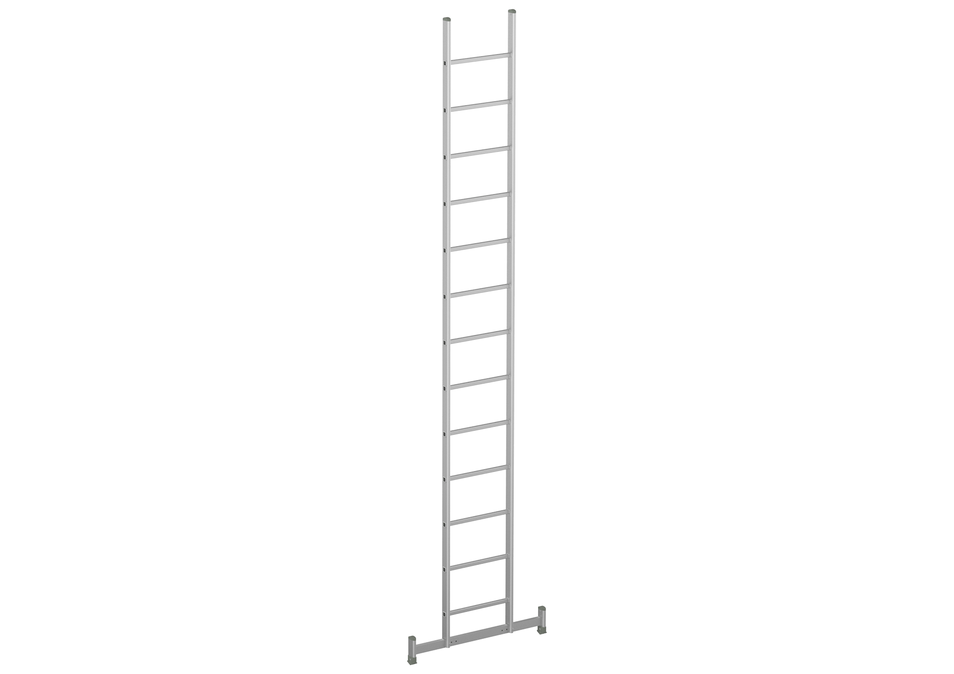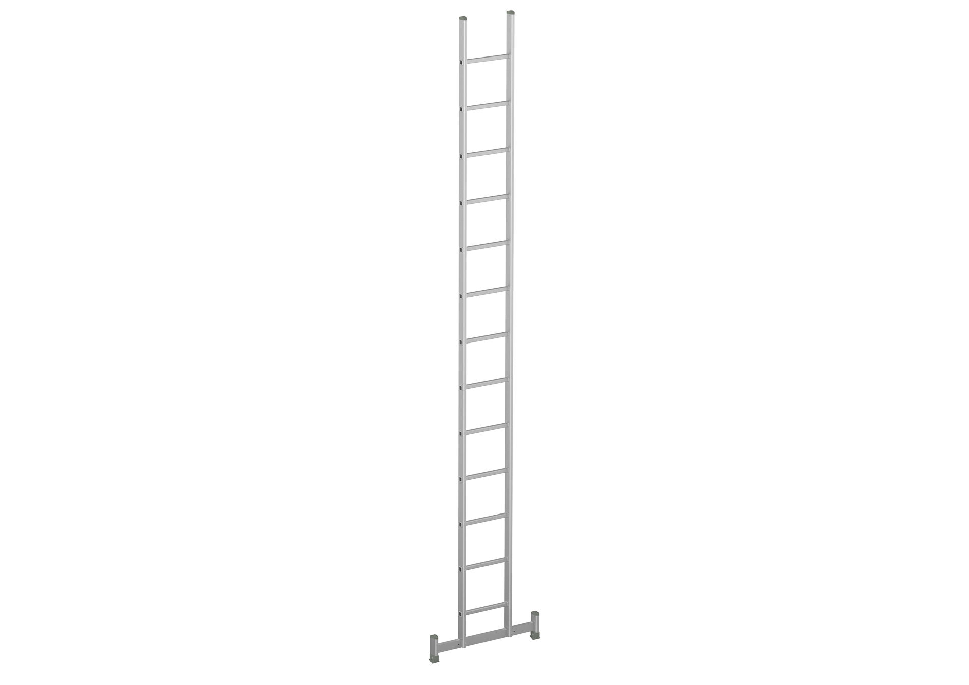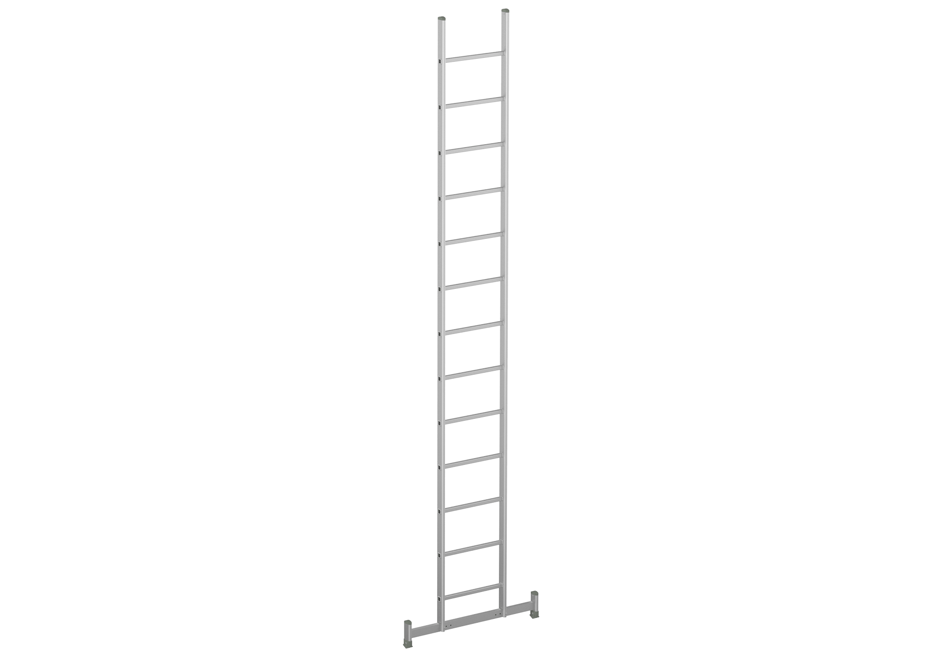 Single ladder, all aluminum – distance between rungs: 280 mm – rung section 25 x 25 mm – extruded profile – non-marking pads – available in two widths: 320 mm and 452 mm – models with 12 rungs and above supplied with an aluminum stabilizer equipped with pads.